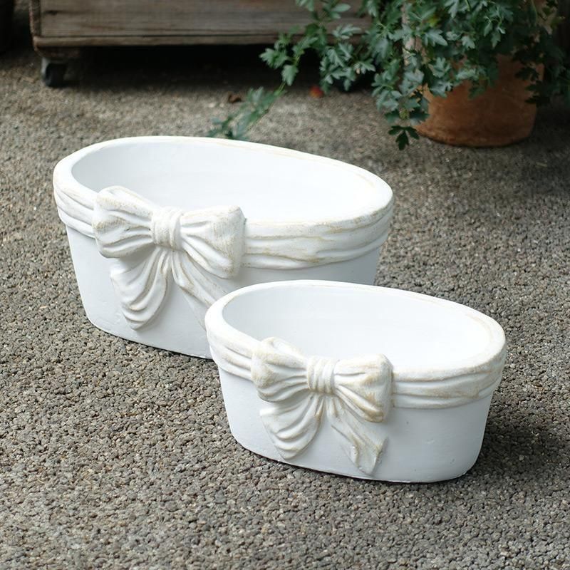 リボンの造形が可愛い植木鉢・オーバルプランター、楕円ポット。