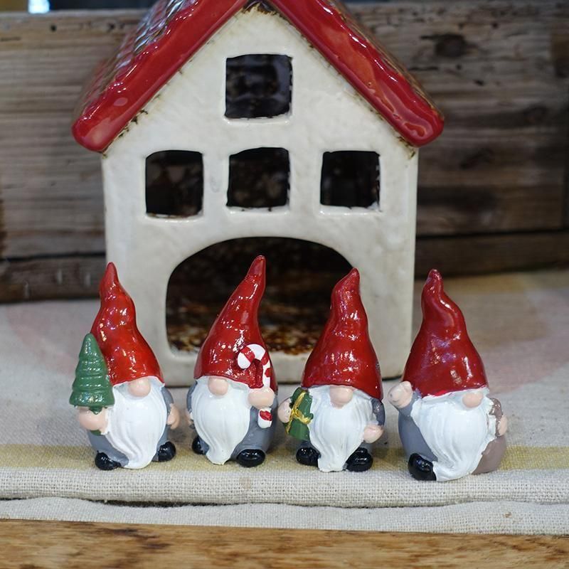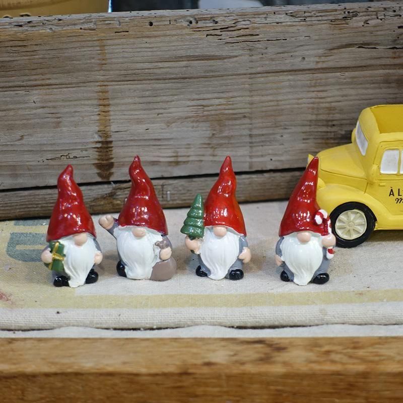 ノーム(小人・精霊)のフィギア4個セット。それぞれ持ち物と表情が異なっています。机やテーブル、お部屋、プランターになどに飾って。