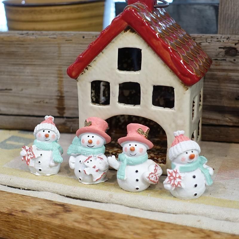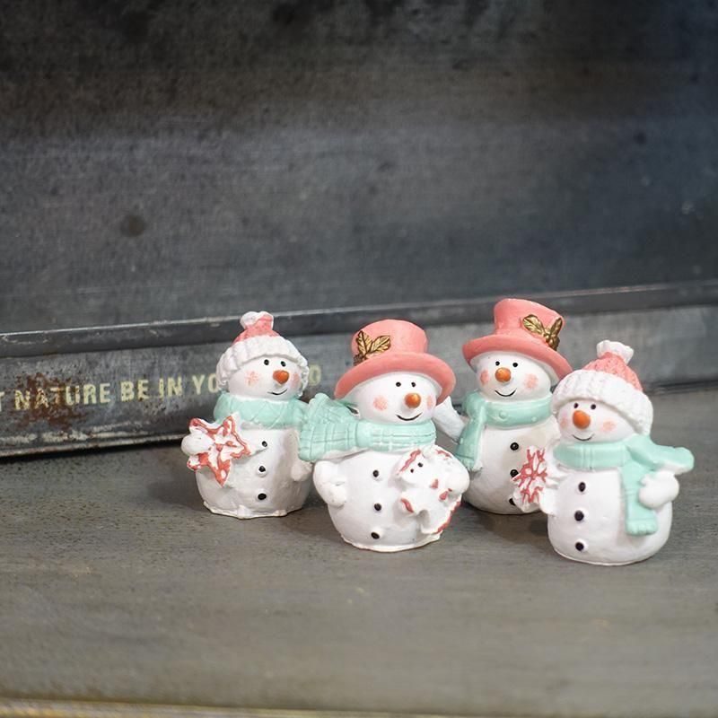 スノーマンのフィギア4個セット。それぞれ持ち物と表情が異なっています。机やテーブル、お部屋、プランターになどに飾って。