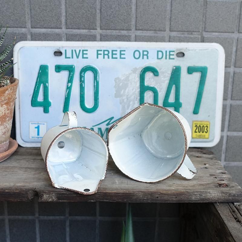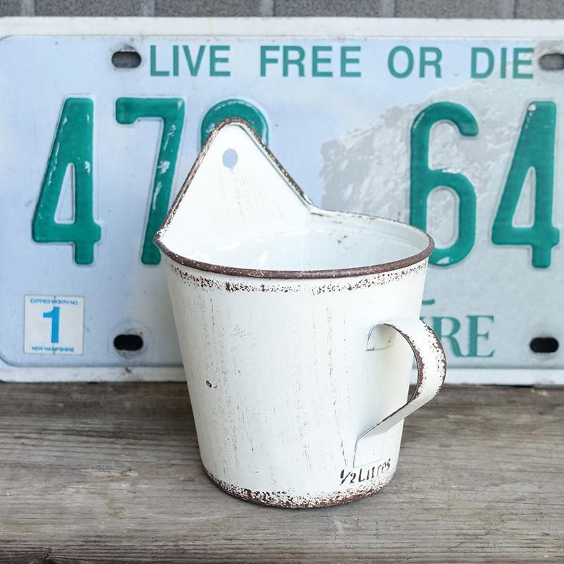 ヨーロッパの蚤の市で見つけた様なカップ形ハンギングポット。縁にスパッタリング加工を施したブロカント仕上げ。壁掛け用と底穴がありインナーポット(透明のカップ)付です。ロゴはエンボス(凸凹)加工でSサイズLサイズとも1/2Litresです。
